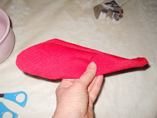 Fig 1: dopo aver tagliato un quadrato di carta crespa, di dimensioni maggiori rispetto al portavaso. piegarlo prima a metà, poi su se stesso